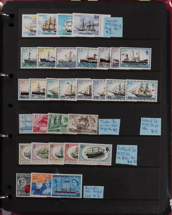 450 imageBritish Commonwealth 1970s/80s MNH Pic/Commem accumulation in 6 sheet files with Falkland Is (70 sets) with 14 diff (cat £100) inc 1983 150th Anniv to £2 (blks of 4) & 1981 Shellfish plate number blks, plus 1982 Liberation M/Sheets (7), Kiribati (FV A$220), 1979 Pic sets to $5 Flag (20 sets) & 1981 Island Maps gutter blks of 10. Pitcairn Is to 1987 with 1977 Defs to QEII $2 (100 sets in sheets of 25, FV $520, plus another 160 sets (13 diff) inc 1980 Handicraft (17). 1984 Fish to $3 (12 sets, FV $126), 1985 Paintings (13 sets, FV $30). 1985 & 87 Ships & 1987 Trees, total FV NZ$980. Tokelau Is Pic/Commem sets (200+, FV NZ$490) 14 diff inc 1969 History (30 sets), 1976 Pics to $1 (26), plus 1981 Reprint set (16), 1982 Fishing (16 sets), 1984 Copra Industry strips of 5 (32). 1984 Defs to $2 Black Marlin (12 sets), 1986 Architecture (12 sets) & 1986 Flowers (12 sets). All fresh MNH with 660 sets in total with high total FV A$1600), plus another A$190 cat for the Falkland Islands. All VF fresh MNH. (100s of sets) (Image1) (Image2) (Image3) (Image4) (Image5) (Image6) (Image7) (Image8) (Image9) (Image10)