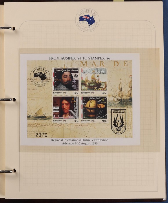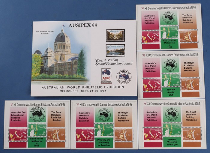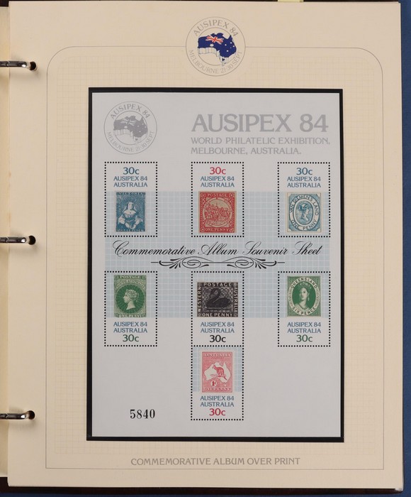 441 imageAUSIPEX 84 extensive collection in 4 customised Commem volumes M & U with Australian issues inc Commonwealth Games opt, AUSIPEX/Stamp Week booklets M/Sheet, AUSIPEX M/Sheet opts Commem album opt & 4 other diff opts, ASDA Dinner opt MS in folder, opt PSEs & M/Sheet with set of 10 Exhibition cancels plus FDC set of 10, Benham silk covers set of 10, Aerogramme set of 10. Then World issues inc French Polynesia set & M/Sheet perf & imperf, Great Britain £4 Royal Mint + £4 Christian Heritage opt AUSIPEX booklets + many others. Largely VF, retail c$1200. (70+ M/Sheets, 44 sets, 27 covers, 9 booklets) (Image1) (Image2) (Image3) (Image4) (Image5) (Image6) (Image7) (Image8) (Image9) (Image10) (Image11) (Image12) (Image13) (Image14) (Image15) (Image16) (Image17)