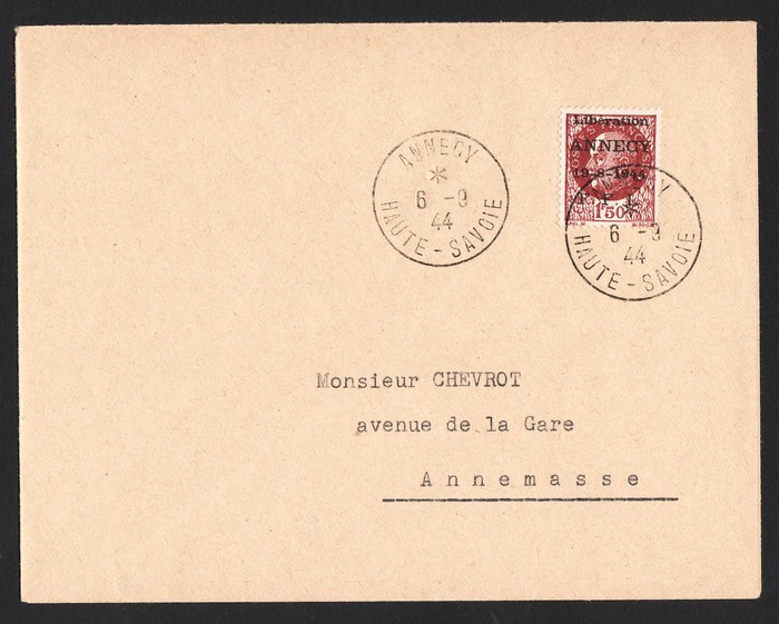 'Liberation Annecy 19-8-1944 FFI' opt Petain 1.50Fr, tied to cover 'Annecy Haute-Savoie 6-9-44' cds. Yv 1 cat €60 for M, Mayr 1 cat €125+. (Image1)