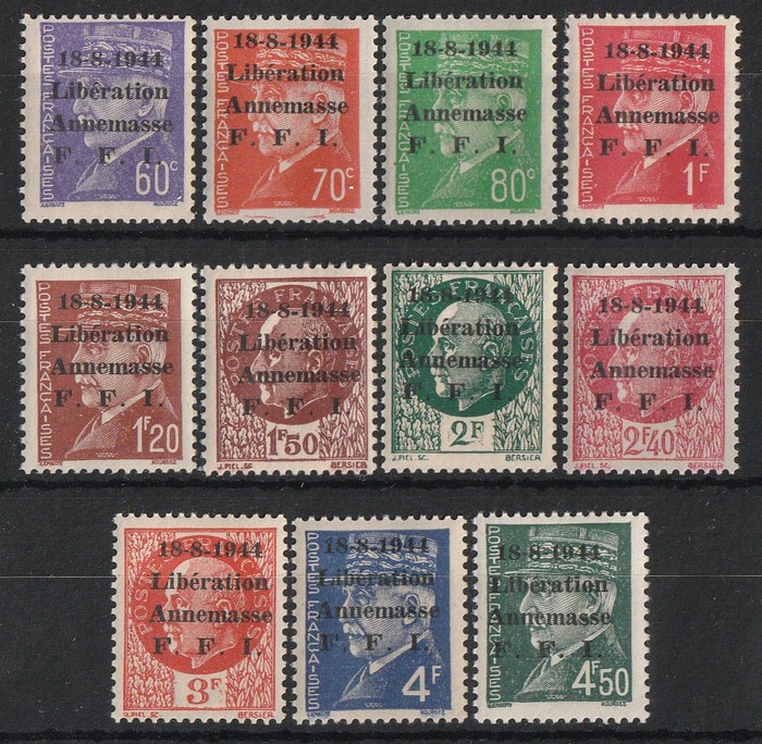 '18-8-1944 Liberation Annemasse F.F.I.' opt on Petain set 70c-4.50Fr. Superb fresh MNH. Mayer 1-11 cat €285+, Yv 1-11 cat €285+ both for M, plus premium for MNH. (11) (P)