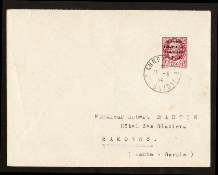 '18-8-1944 Liberation Annemasse FFI' opt Petain 1.50Fr tied to cover by 'Annemasse Savoie 18-8-44' cds. Yv 6 cat €25 for M. Mayer 6 cat €40+. (Image1)
