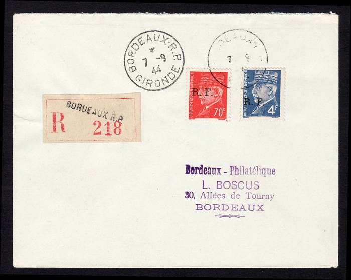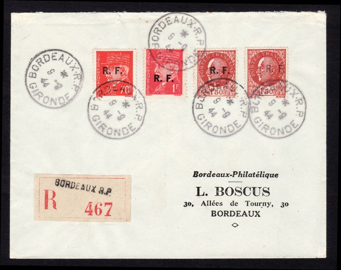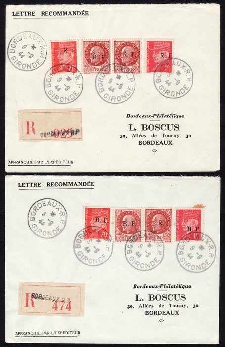'R.F.' opts (3 diff) thin letters, seriffed & sans-seriffed on Petain 70c & 4Fr tied to registered covers by 'Bordeaux R.P. Gironde 7-9 44' Yv 2 & 10 I+II+III, Mayer 2 & 10 I+II+III cat €200+. (6 on 3 covers). (Image1) (Image2)