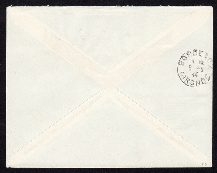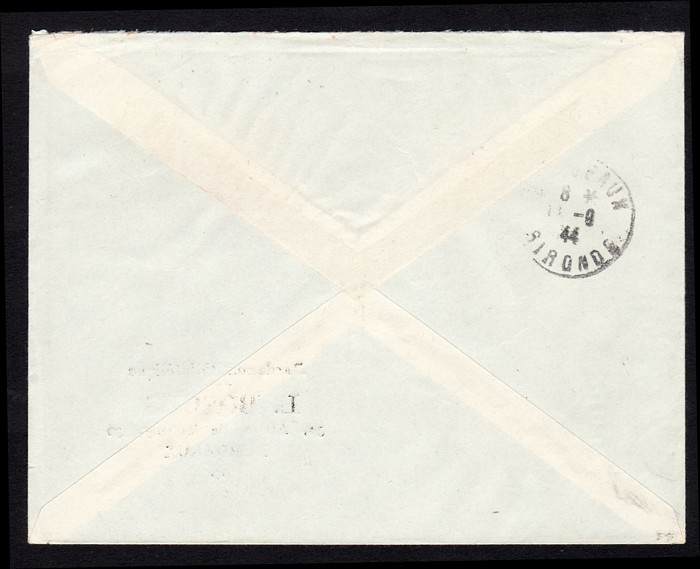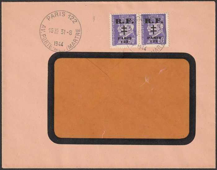 (cross) Paris 122' opt Petain 60c pr, tied to cover by 'Paris 122 Av Porte Montmartre 31 8 1944 cds. Mayer 24 cat €340. (P) (Image1) (Image2)
