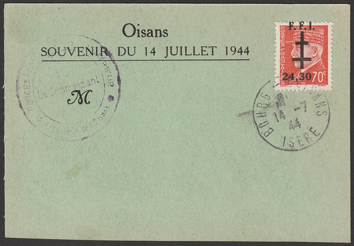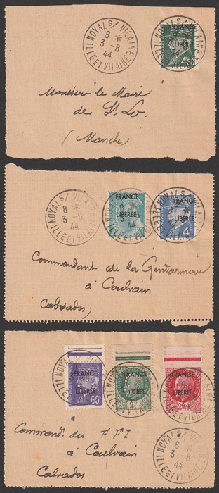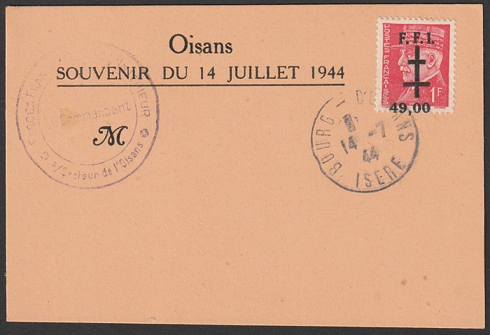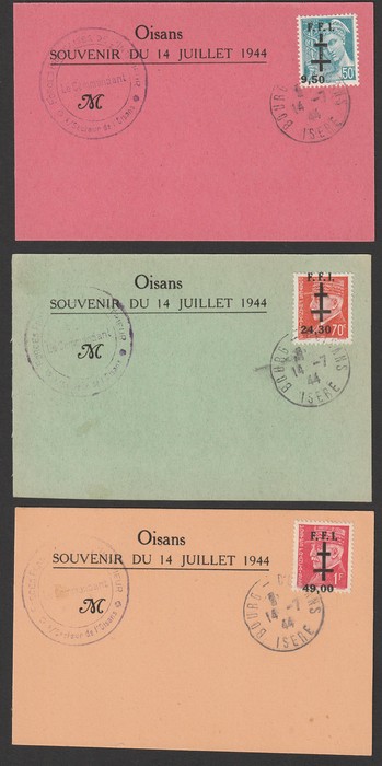 1944 'FFI & Cross' opt set 50c+9.50F to 1F+49F. Tied to souvenir cards by 'Bourg D'Oisans Isere 14 7 44' cds. Mayer 1-3 cat €640+. Yv 1-3 cat €900. Only 500 sets printed & rare genuine. Exp Ceremuga. (P) (Image1) (Image2)