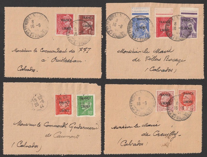 'RF' opts range with Petain 70c, 80c, 1F, 1.20F, 1.50F(2), 2F, 2.40F, 3F, 4F, 4.50F (plus Mercury 20c-50c W/O opts). On 8 covers - 2 registered tied by 'Chatellerault Vienne 16 9 44' cds. Yv 2-10 & 12, Mayer 2-10, 12 cat €1680+. Very rare issue.