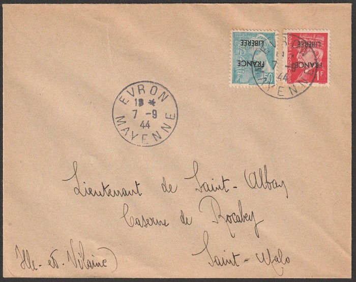 LIBEREE opt Mercury 50c & Petain 1F - both opt INVERTED. Tied to cover by 'Evron Mayenne 7 8 44' cds. May 4(var) & 8(var) cat €2200+. (P) (Image1) (Image2)