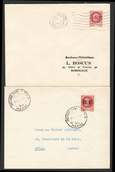 1944 thick 'R.F.' opt Petain 1.50Fr tied to cover by 'Reims Emile Zola Marne 2 9 1944' cds thematics plus Bordeaux thin 'RF' opt tied to cover by 'Bordeaux Gironde 1 9 1944' machine pmk. Yv 1&6 cat €44 as M. Mayer 1&6 cat €160+. (2). (Image1)