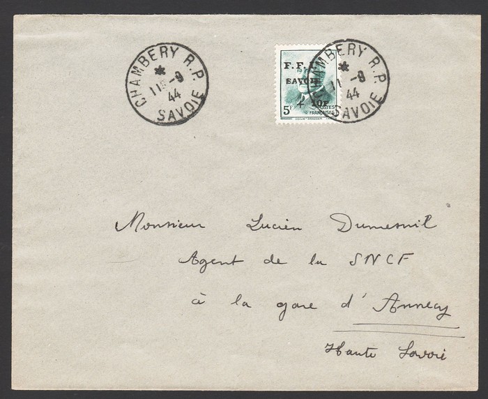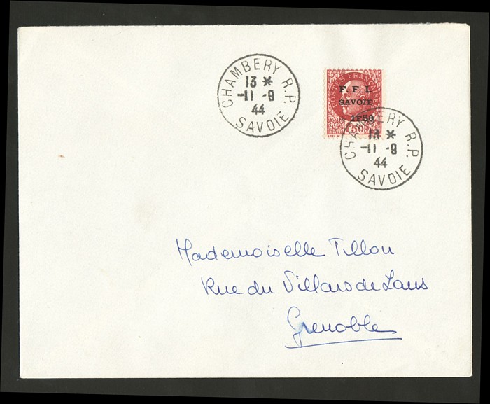 Savoie + 1F50' opt Petain 1.50Fr, tied to cover by 'Chambery R.P. Savoie 11 9 44' cds, b/s 'Grenoble Gare Isere' Yv 1 cat €30 as M, Mayer 1 cat €140. (Image1)