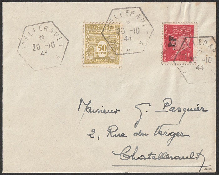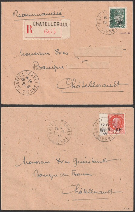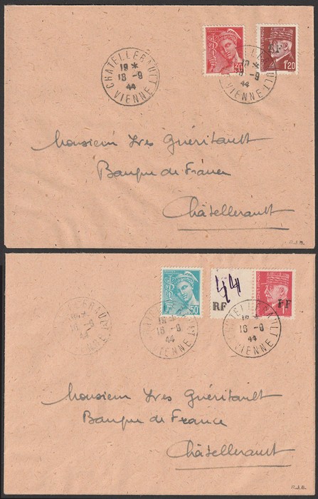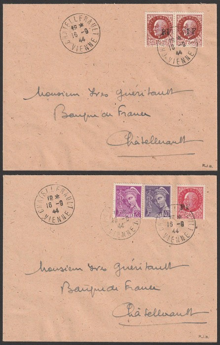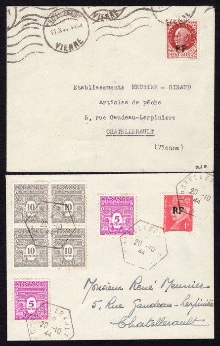 'RF' opt Petain 1F, plus 'Arc' defins 5c (2) & 10c (4), plus opt Petain 1.50 single franking, tied by 'Chantellerault 19 (or 20) 10 44' hexagonal pmks. Yv 4 & 6. Mayer 4 & 6 cat €320. (2 covers) (Image1)