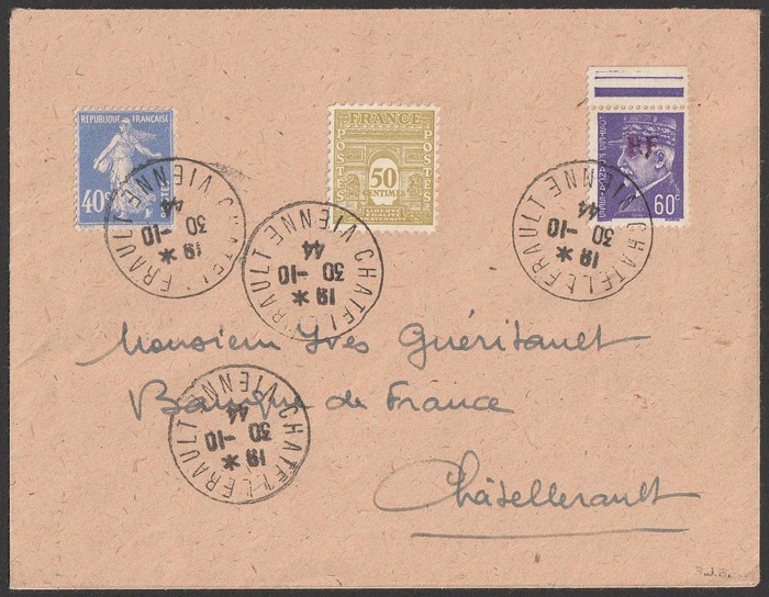 'R.F.' opt in RED (instead of black) on Petain 60c, with Ceres 40c & 'Arc' 50c tied by 'Chatellerault Vienne 30 10 44' cds. Yv 1a, Mayer 1a cat €280+. (P) (Image1)