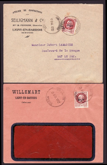 1944 'RVF' opt Petain 1.50Fr brown & dark brown on 2 covers, tied by 'Ligny en Barrois Meuse 9 (0r 15) 9 44' cds. Mayer 1&1a ct €150+. (2). (Image1) (Image2)