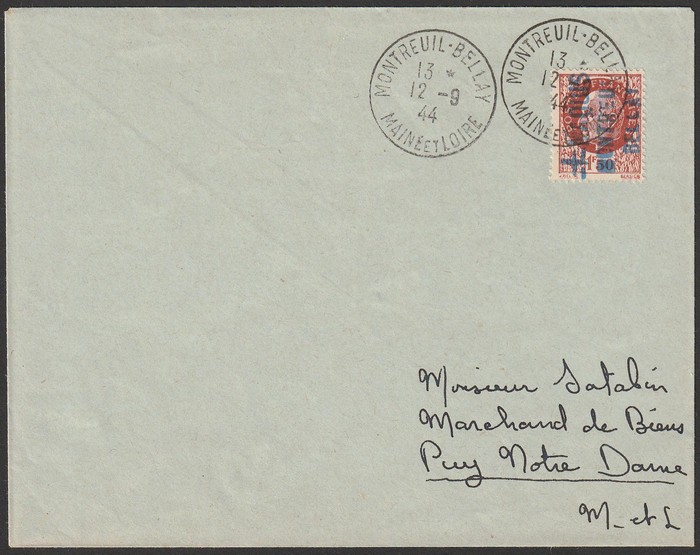 1944 '+ Maquis Montruil Bellay' opt Petain 1.50F, tied to cover by 'Montreuil-Bellay Main et Loire 12 9 44' cds. Yv 9 cat €200 as M. Mayer 7 cat €250+. (P)