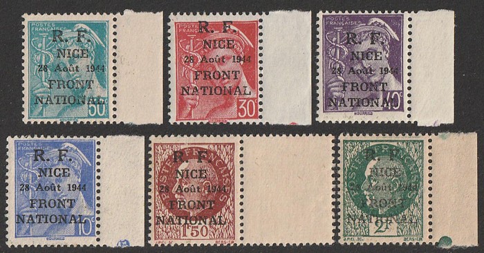 NICE 28 Aout 1944 FRONT NATIONAL' opt on Mercury/Petain set 10c-2Fr, with security underprint on reverse. VF fresh MNH. Mayer 1-6 cat €180+ for M, plus premium MNH. (6)