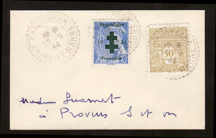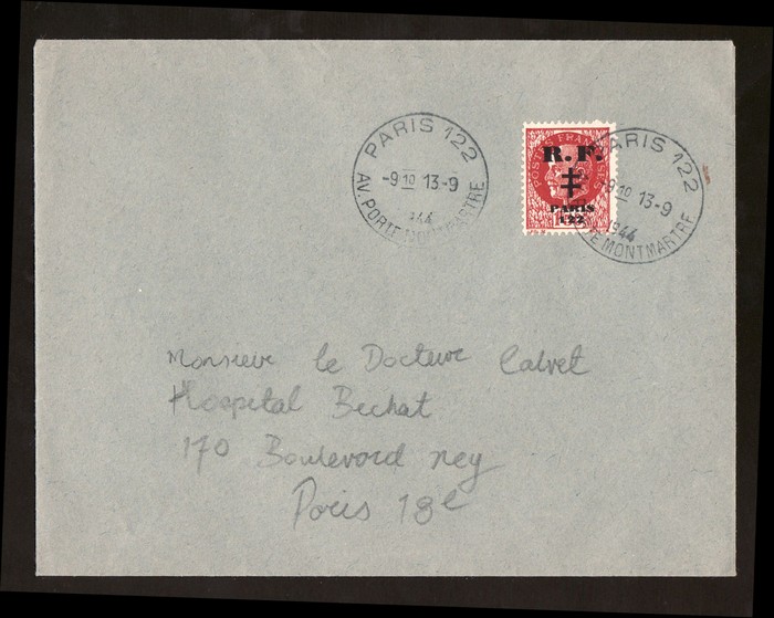 (cross) Paris 122' opt Petain 1.50Fr tied by 'Paris 122 Av Porte Montmartre 13 9 1944' cds. Mayer 26 cat €170. (Image1)