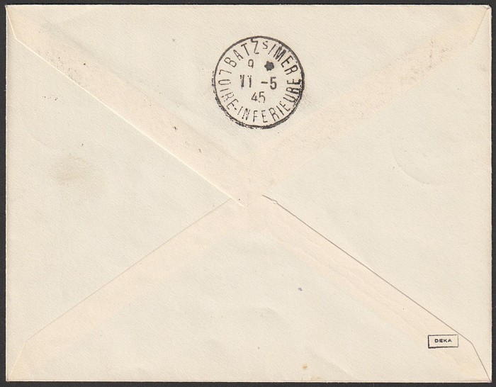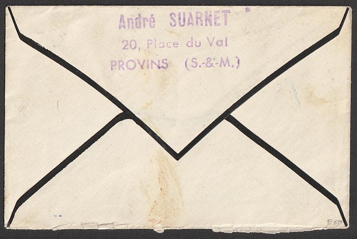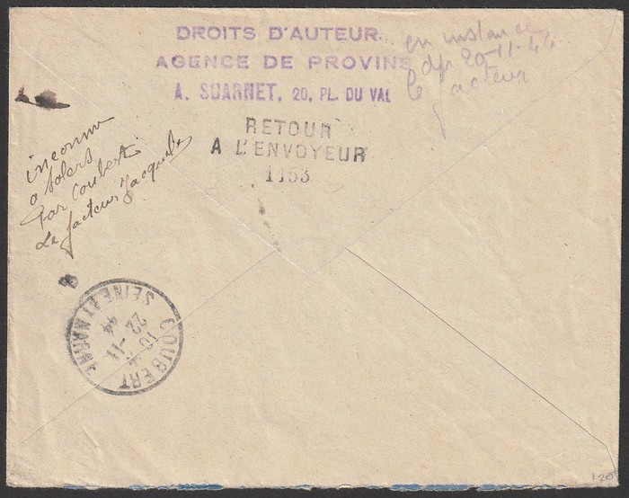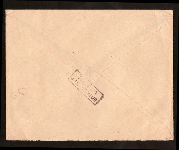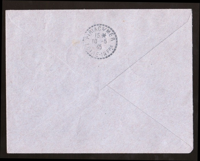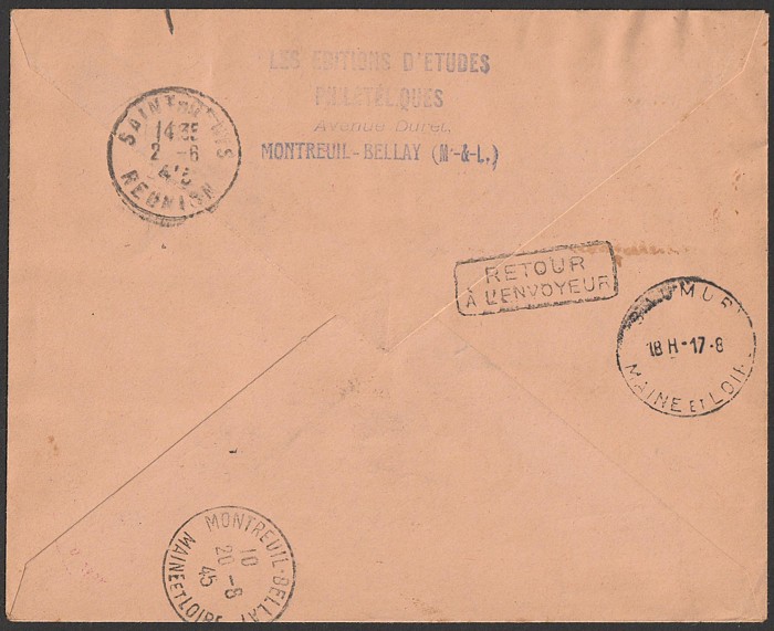 (Return to sender) b/s 'Saint Denis 2 6 45' cds, & on return 'Saumur 17 8 Main et Loire' & Montreuil-Bellay Maine et Loire 20 8 45. Mayer 1RF cat €500. Only 25 covers with red cachet flown. (P) (Image1) (Image2)