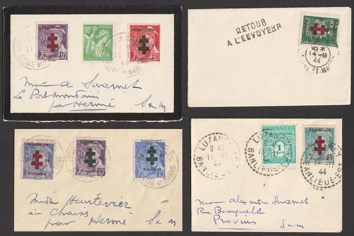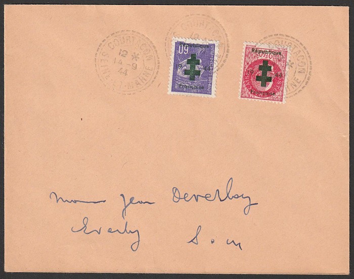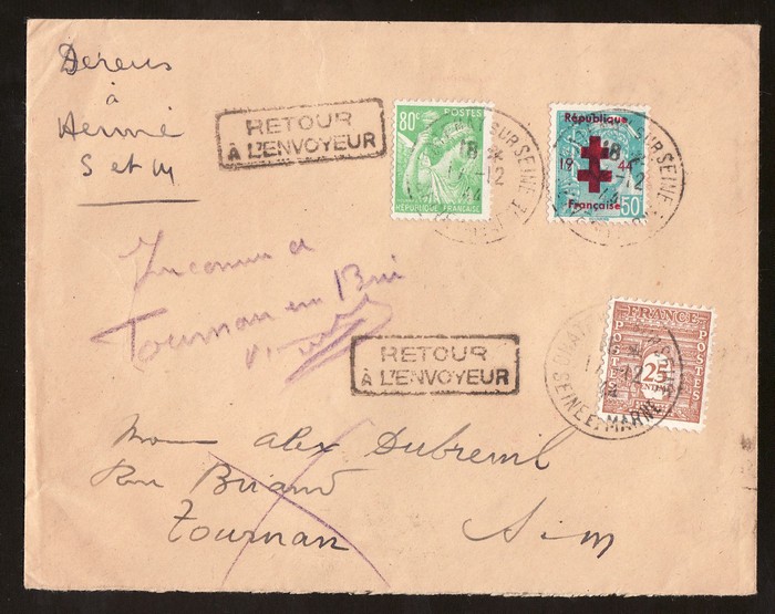 'Republique Francaise 1944' opt red on Mercury 50c, with Iris 80c & Arc 25c tied by 'Chatfmay? Sur Seine et Marne 17 12 44' cds, with boxed 'Retour a L'Envoyer (Return to sender). Mayer 7 cat €40++, plus premium for unusual usage. (Image1) (Image2)