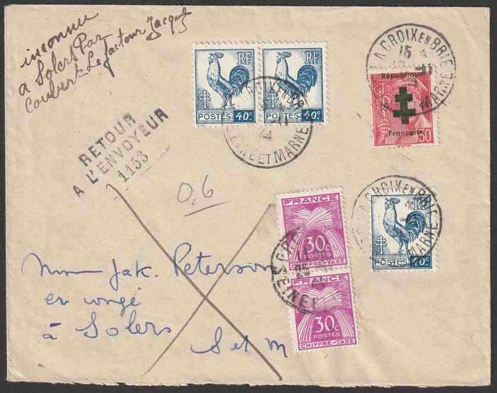 'Republic Francais 1944' opt Mercury 30c in green with Cock 40c (3) tied by 'La Croiz en Brie Seine et Marne 19 11 44' cds with 'Retour A L'Enjoyeur' h/s (return to sender) & taxed 60c with Postage Due 30c pr. Mayer 3 cat €30++, plus premium for
