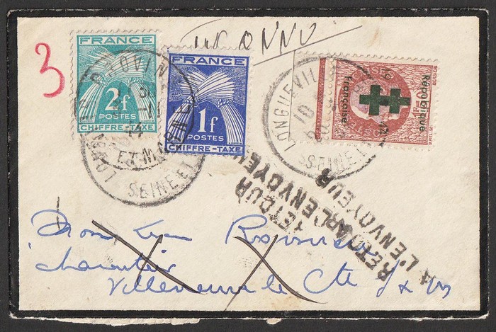 'Republique Francaise 1944' opt on Petain green op INVERTED 1.50F tied to cover by 'Longueville Seine et Marne 23 10 44' cds but undeliverable & endorsed 'Inconnu' (unknown) & h/s 'Retour a l'envoyeur' (return to sender) & taxed '3' in red with