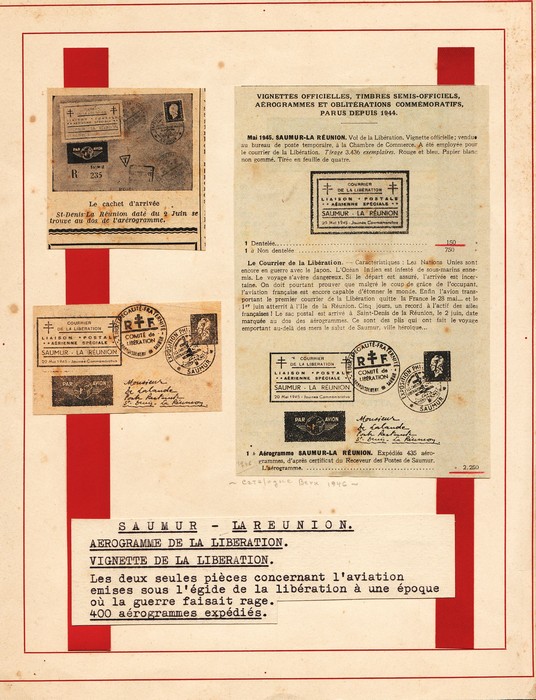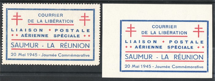 'Courrier de la Liberation' Liaison Postale Aerienne Special Saumer-La Reunion 20 Mai 1945 Journee Commemorative' labels perf & imperf. VF fresh UN as made. Mayer 1 & 1a cat €115. (2). (Image1)
