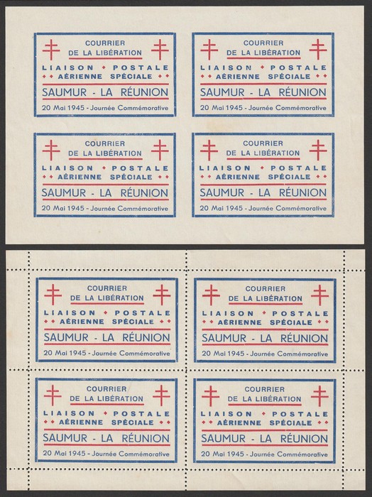 'Courrier de la Liberation Liaison Postale Aerienne Special Saumer-La Reunion 20 MAI 1945 Journee Commemorative' labels in sheetlets of 4 perf & imperf. VF fresh UN as made. Mayer 1&1a cat €460 as singles. (2 blks). (P) (Image1)