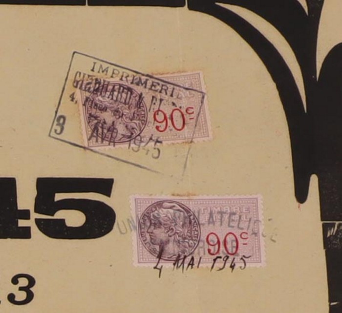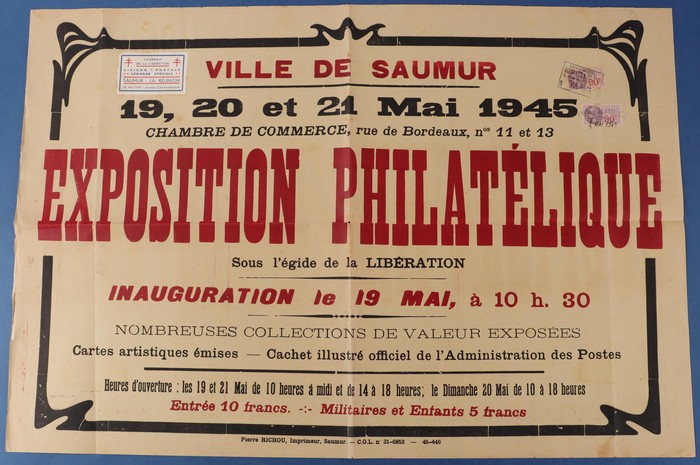 'Courrier de la Liberation' Liaison Postale Aerienne Specal Saumur-La Reunion 20 Mai 1945 Journee' Commemorative label affixed to Exhibition Poster (610x425mm) with Revenues 90c (2) tied by F/C. Mayer 1 cat €35++ as loose stamp & rarity as