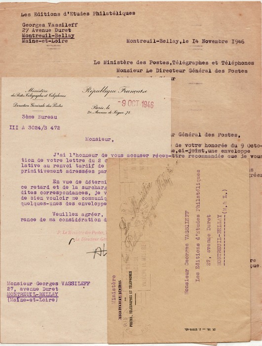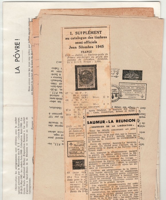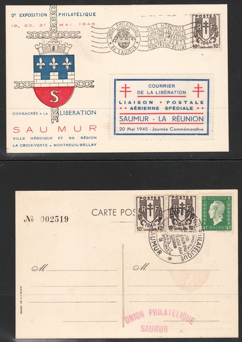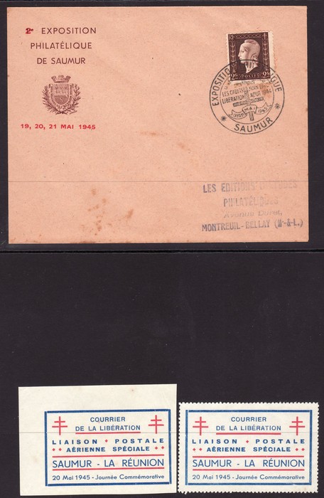 Philatelic Exhibition related material inc Saumur-Reunion Exhib labels perf (2), imperf, & trimmed, plus Exhib Postcards (3), plus many pgs of info on what was to be available to buy, official correspondence etc. Mayer 1&1a cat €200++. (Image1) (Image2)