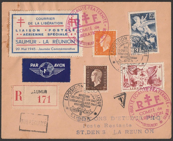 Registered cover franked Saumur-La Reunion Airmail label with Marianne 2F & 5F, Liberation Pics 4Fr (2 diff). To Reunion with Comite de Liberation red cachet (2) & Philatelic Exhibition cachets (2), boxed 'Non Reclame' h/s, with Retour & L'Envoyeur