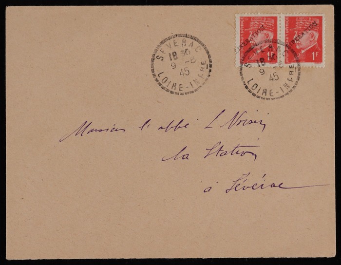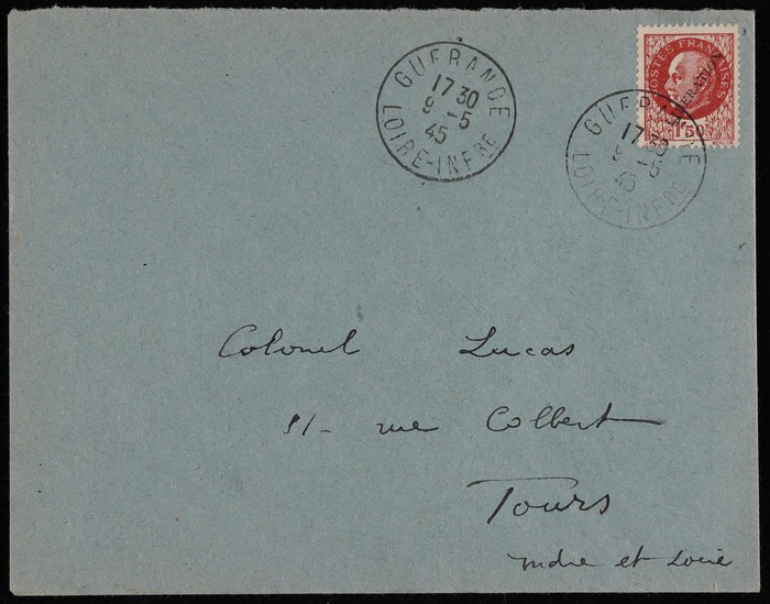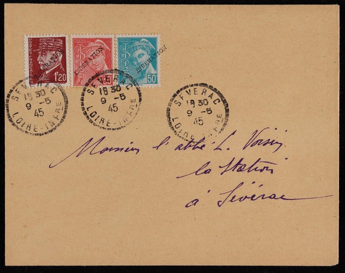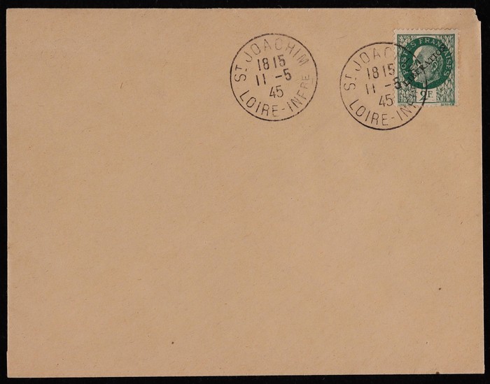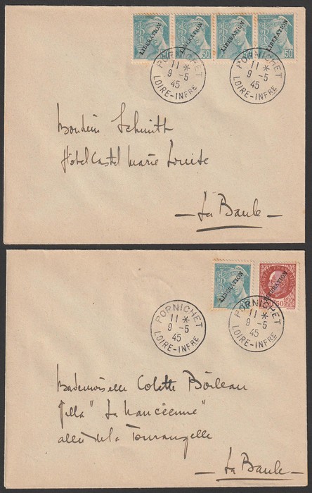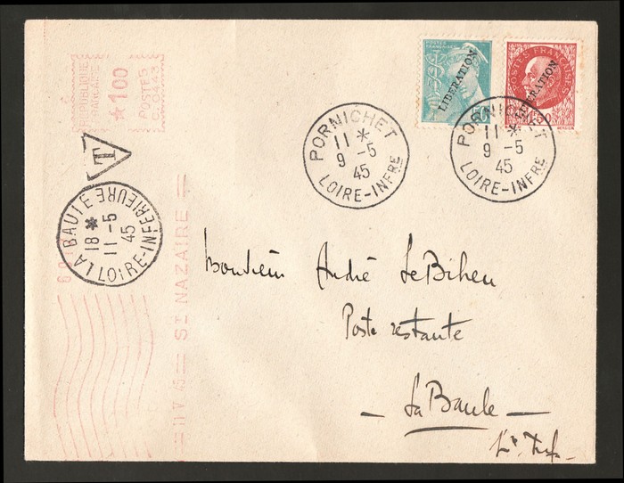 LIBERATION opt Mercury 50c & Petain 1.50F tied by 'Pornichet Loire Infre 9.5.45' cds, plus triangle 'T' &, plus Franking Machine 1Fr date '11 7 45 St Nazaire' for Poste Restante fee. Mayer L1 & L2 etc at €200++. (Image1) (Image2)