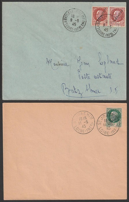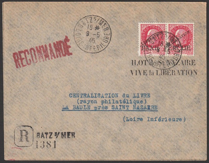 LIBERATION opts covers franked Petain with 80c 2.40F registered & 4.50F Registered Express, ea with s/l h/s 'Taxe Percue, Ilot de St Nazaire, Vive la Liberation' All with 'Batz s Imer, Loire Inferieure 9 5 45' cds. Mayer L2 cat €600+. (3). (P) (Image1) (Image2)