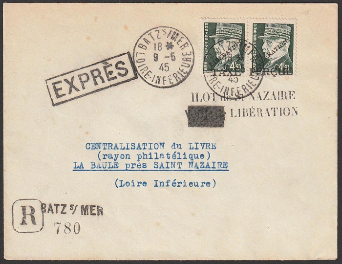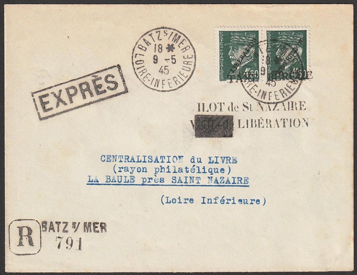 LIBERATION opts Petain 4.50F pr, tied by 'Batz s Imer Loire Inferieure 9 5 45' cds to Reg & Express cover, with 2-line 'Ilot de St Nazaire Liberation' cachet. Mayer L3 cat €500+. (P) (Image1) (Image2)