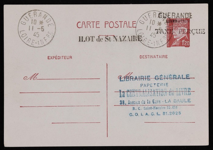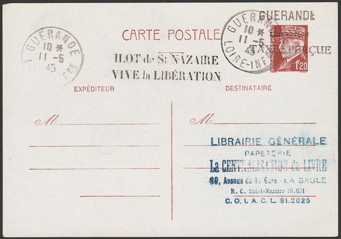 'LIBERATION' h/s opt on Petain 1.20Fr postal card, with 'TAXE PERCUE' postage paid h/s & 'ILOT de St NAZAIRE / VIVE la LIBERATION' at left, with 'Guerande 11.5.45' cds & 'GUERANDE' s/l. Superb fresh. Mayer L13 cat €600. Rare & attractive. (P) (Image1)