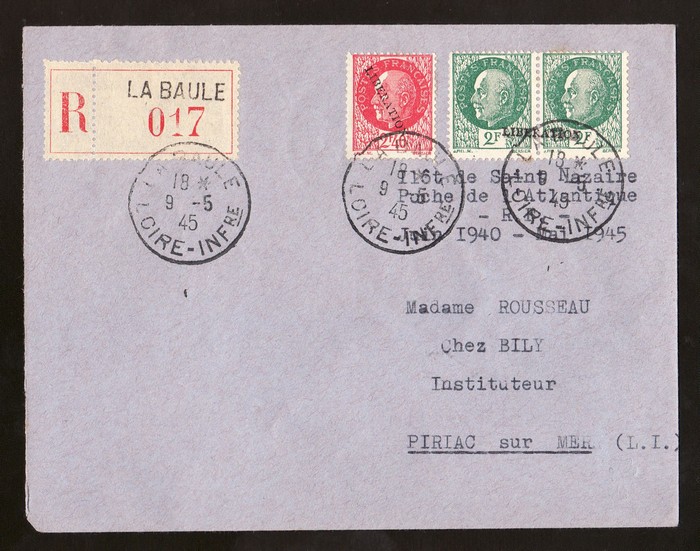 LIBERATION opt Petain 2Fr pr with single opt across both stamps, plus 2.40Fr normal opt, tied to Registered cover by 'La Baule Loire Infre 9 5 45' cds. Mayer L2 & L2(var) cat €300++. (Image1) (Image2)
