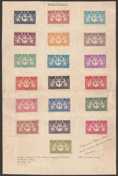 set 10c-20Fr, IMPERF proof colour trials. VF UN as made, all 4 margins, mounted on De La Rue archive pg dated 14 November 1944 which has folds & dirty as was printer's working proof, with notations that colours are approved but values are to be