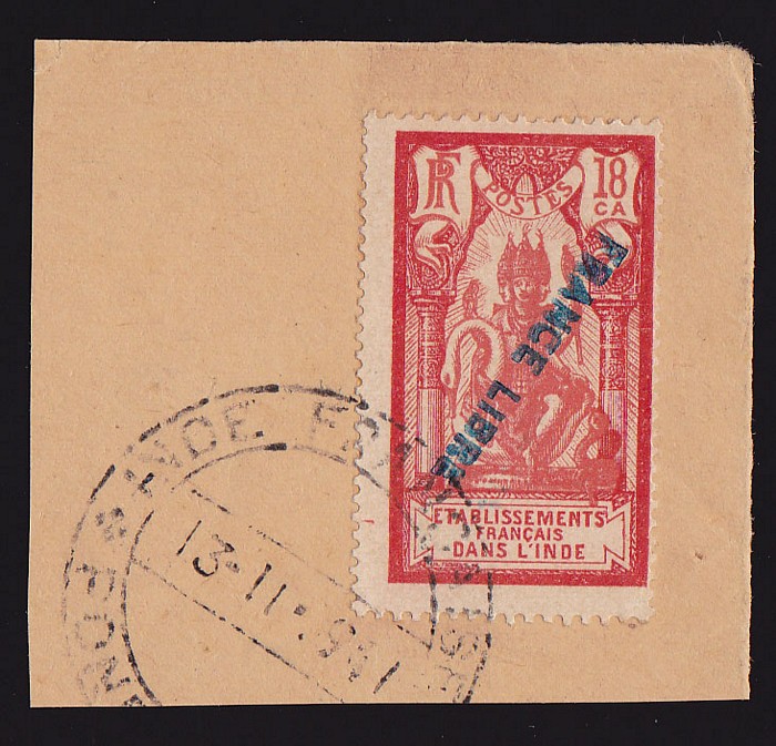 LIBRE' blue opt Brahma 18ca vermilion & carmine, error INVERTED h/s opt from 2nd printing. VFU on piece. SG 141(var) cat £750 as normal, plus premium for inverted, Yv 139a cat €1500+. Key stamp as normal, extremely rare as invert error.