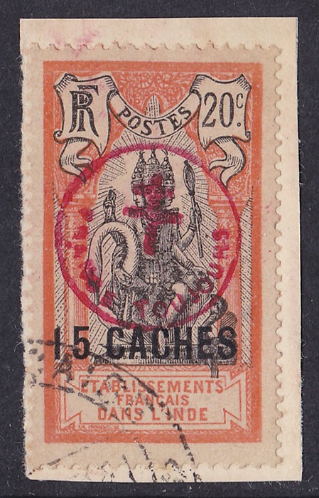 Toujours' & Cross circle h/s opt Brahma 15ca on 20c, from 2nd printing. VFU on piece. SG 162a cat £350, Yv 230A cat €400. Only 200 printed. (P) (Image1)
