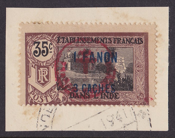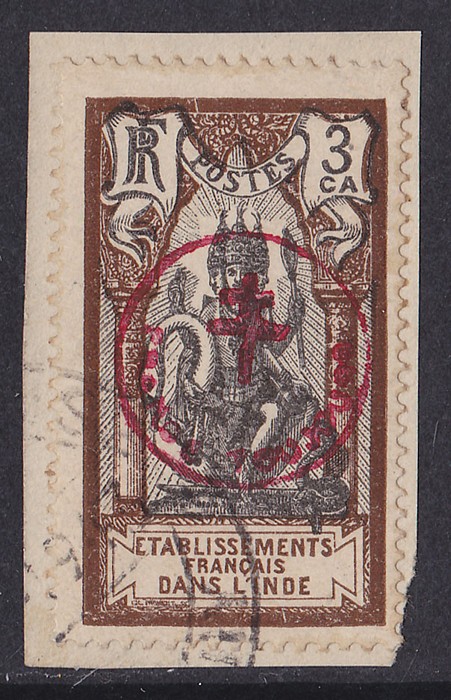 Toujours' & Cross circle h/s opt Brahma 3ca black & chocolate-brown, from 2nd printing. VFU on piece. SG 162e cat £300, Yv 230E cat €375. Only 200 printed. (P)