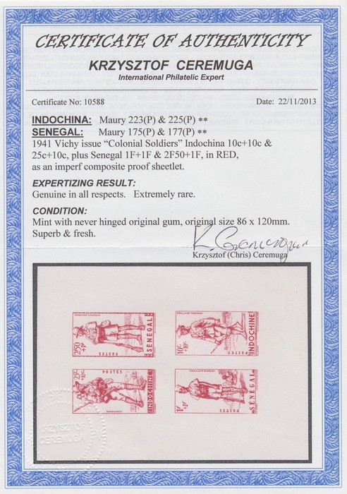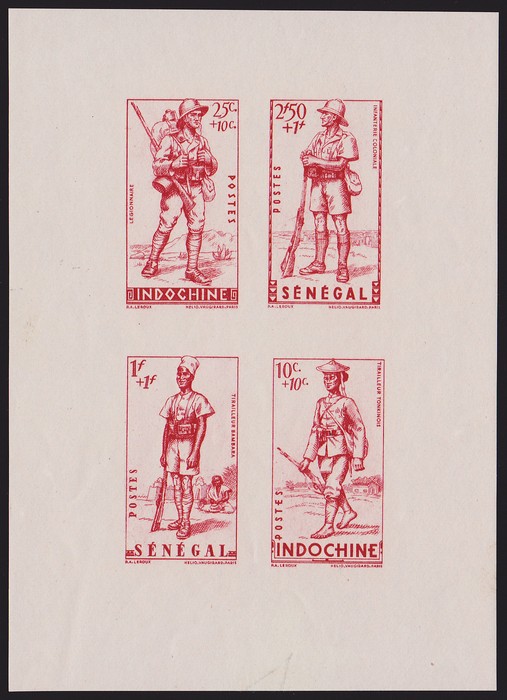 Vichy issue colonial soldiers imperf proof M/Sheet of 4 setenant in red, with Indochina 10+10c & 25+10c, & Senegal 1+1Fr & 2.50+1Fr. Superb fresh MNH. Maury 223(p) & 225(p), & 175(p) & 177(p) cat €5400, Yv 219a & 221b, & 170a & 172b unpriced as