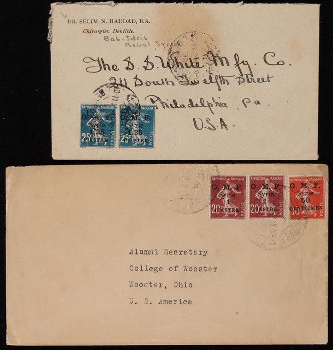 franked OMF Syrie 4-line opts 50c/10c red & 1Pi/20c brown pr (SG 70 & 72) with indistinct cds, plus 1922 franked 4-line opt 'OMF Syrie 1.25 Piastres' on 25c blue pr (SG 96b) tied 'Beyrouth 10 11 22'? cds. Both from Beirut to USA. (2) (Image1)