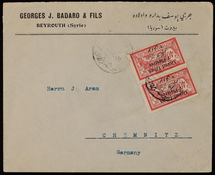 franked 'OMF Syrie' 3Pi/60c Merson (SG 82) tied by indistinct 'Beyrouth' cds, plus 1924 franked 'Grand Liban' 2Pi/40c Merson (SG 35) pr, indistinct cds. Both to Chemnitz Germany. (2) (Image1) (Image2)