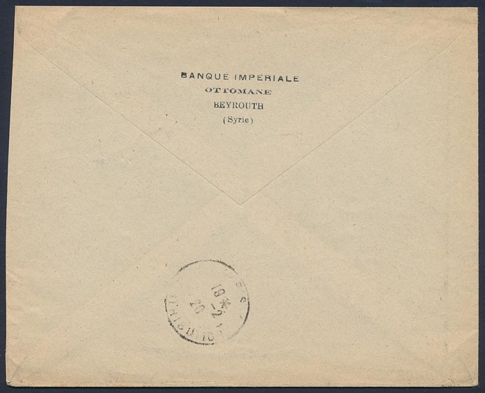 Registered cover franked Levant 'TEO' opt 2Pi/50c tied by 'Beyrouth 11 2 20' cds. To Paris. SG 17. (Image1) (Image2)