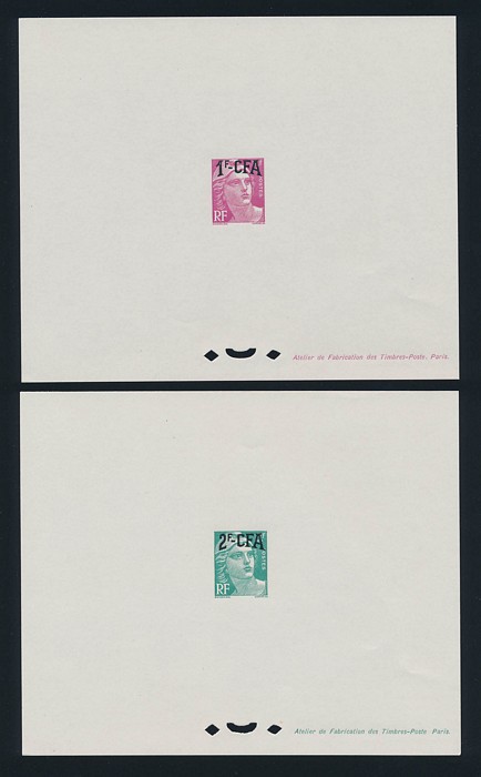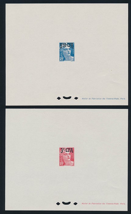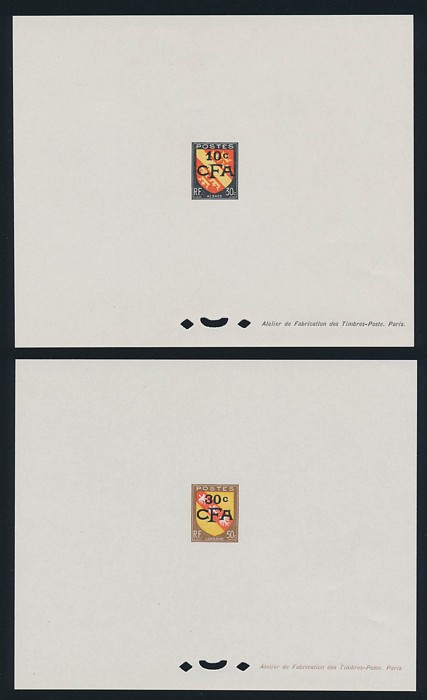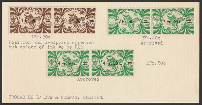 Kogu Bird Surch 1Fr20 on 5c, 2Fr40 on 25c & 4Fr50 on 25c, horiz prs, opt colour trial proof opts in BLACK, with 1Fr20/5c being UNISSUED as such (instead of RED opt). Superb fresh M, all affixed on pieces from De La Rue archive pgs. SG 294, 295 &