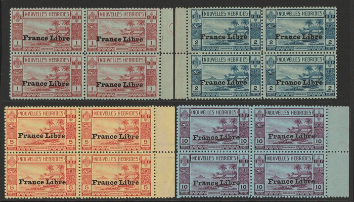 'France Libre' opt Gold Currency 1Fr, 2Fr, 5Fr & 10Fr, marginal blks of 4. VF MNH, usual colonial gum. SG F73-76 cat £436+, Yv 132-35 cat €800+, plus premium for blks (4 blks) (P) (Image1)