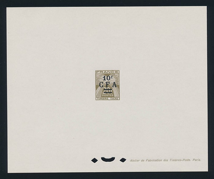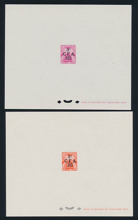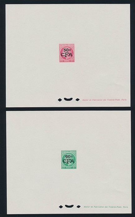 opt Postage Dues 10c-10Fr Epreuvre de Luxes, no 1950-53 issues. VF fresh UN as made, with tissue paper interleaves. SG D333-39(p), Yv T36-42EPL est cat €230. (7)