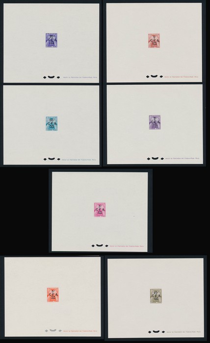 English: 1925 Weapons & Idols 6.25Fr/ 5/- ultramarine imperf PROOF in LR cnr vert pr, with red ink highlighting, varieties to fix. VF UN. SG 51(var), Yv 99(var). Similar French issue cat €120 ea, so €240 for this. Only 1 sheet of 30 printed