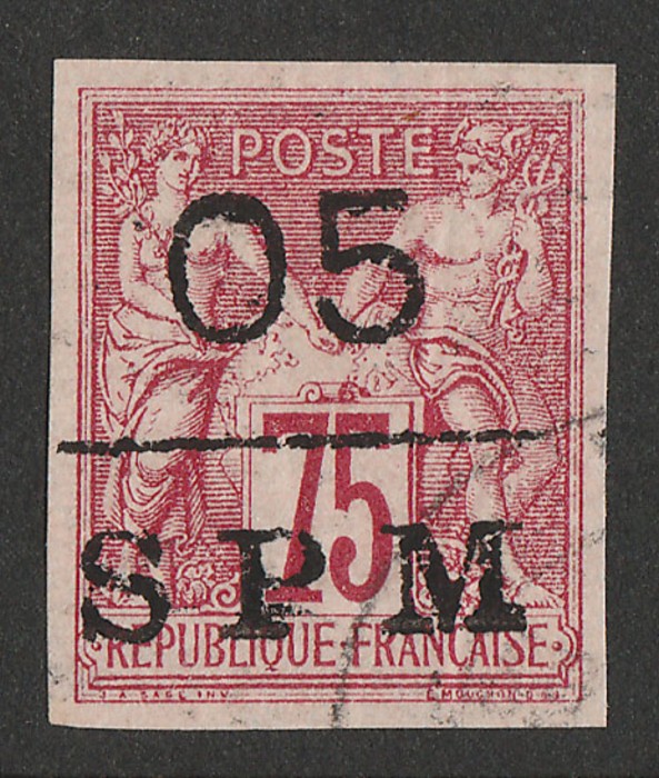 Miquelon: 1885 '05 SPM' opt P&C 75c carmine imperf. Superb U, 4 margins. Scott 5 cat US$300, SG 10 cat £300, Yv 10 cat €300. (P) (Image1)