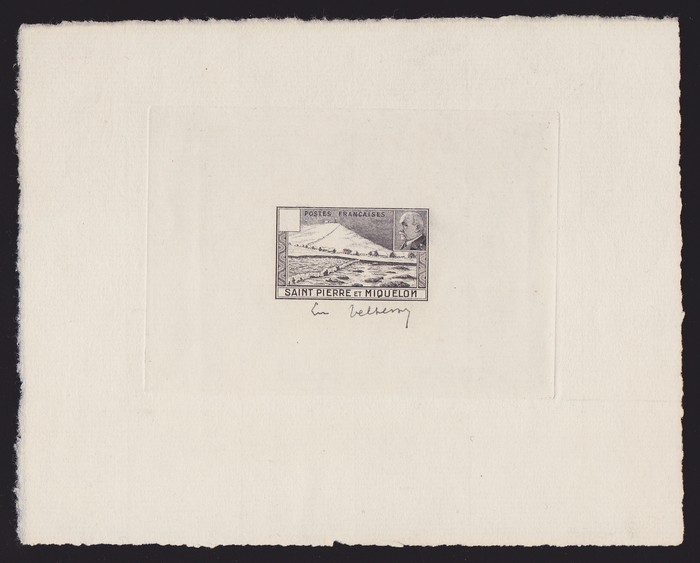 Miquelon: 1941 Petain & View Vichy issue black Epreuvre de Artiste, blank value tablet, on laid paper, signed by engraver. Superb fresh UN as made. SG V411(p), Yv 210aEPA. Extremely rare. (P) (Image1)