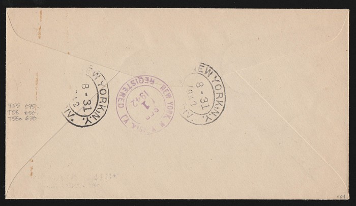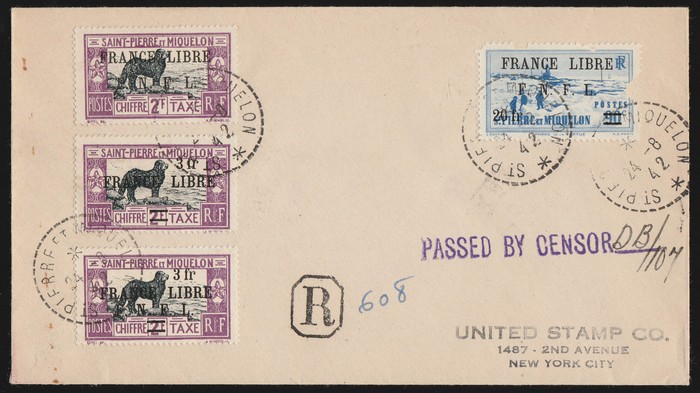 Miquelon: 1942 Registered cover franked 'France Libre FNFL' 2-line opts 20Fr/90c (flts), Postage Dues 2Fr & 3Fr/2Fr, plus the last w/o FNFL. Tied by 'St Pierre et Miquellon 24 8 42' cds, with censor h/s & initials. To New York, with arrival b/s. SG