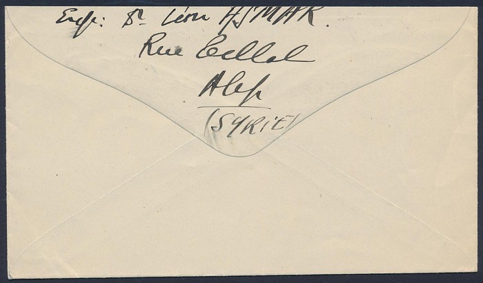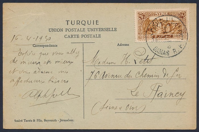 franked 1925 Bridge 3Pi tied by 'Damas 18 AP 30' cds. SG 184. Interesting use of old Ottoman period PPC. (Image1) (Image2)