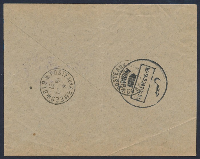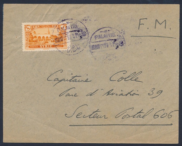Military Mail cover endorsed 'FM' (Frank Militaire) with 4Pi Damascus tied by 'Palmyre' violet cds, b/s 'Homs' & 'Poste aux Armees 16 9 32', 2 diff military cds. SG 252.