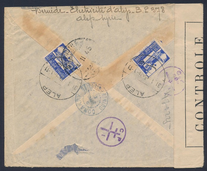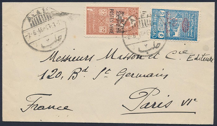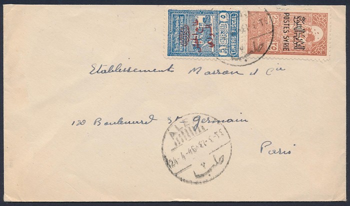 franked opt Fiscals 25Pi brown & 5Pi blue, tied by 'Alep 2 6 46' cds. To Paris. SG 410 & T422 cat £46. Yv 284 & 295 cat €83 - both as loose stamps alone.